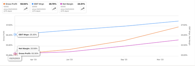 截至2023财年,谷歌(NASDAQ:GOOG)(NASDAQ:GOOGL)拥有约1110亿美元的现金和短期投资,而长期债务约为130亿美元。与现金状况和总市值相比,债务数量非常小,因此可以放心地假设该公司不存在破产风险。如果公司愿意,它可以立即偿还未偿债务。该公司的利息收入高于其支付的利息支出。此外,该公司的流动比率仍然非常强劲,约为2,因此可以肯定地说该公司不存在流动性问题。让我们看看该公司的其他指标在2023年全年的进展情况,首先是利润率。