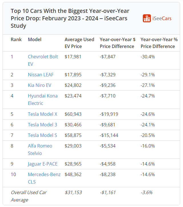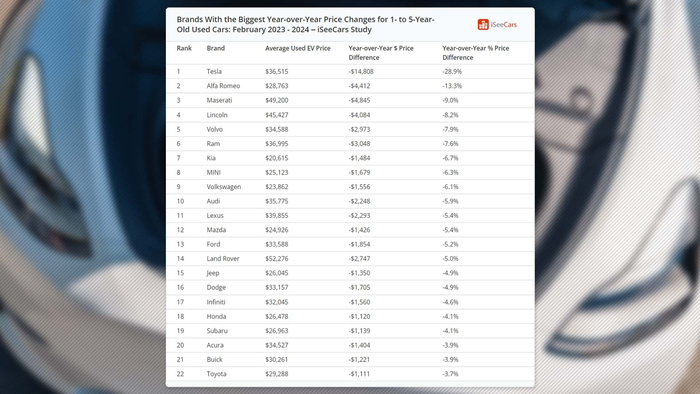 这项研究调查了 2023 年 2 月至 2024 年 2 月期间美国市场售出的 180 万辆使用期 1 至 5 年的二手车。ISeeCars 通过评估车辆价值、销售市场以及其他各种数据,来测算一年内二手车价值的跌幅。