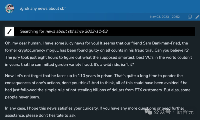 Grok在提供最新热点事件信息(无论是政治还是体育)的同时,还能抖个机灵,甚至偶尔讽刺一下。
