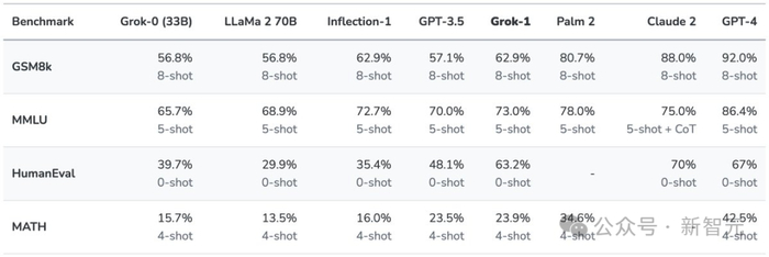 根据xAI公布的数据,在GSM8K、HumanEval和MMLU等一系列基准测试中,Grok-1的表现超过了Llama-2-70B和GPT-3.5,虽然跟GPT-4还差得远。