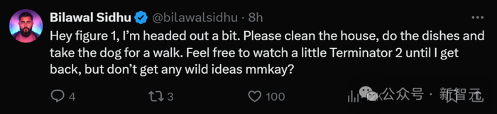 「Figure 1,在我出门时,请你帮我打扫房子、洗碗、遛狗,你可以看《终结者2》,但是不要产生任何疯狂的想法,ok?」