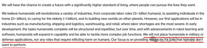 我们不会将人形机器人用于军事或国防应用,也不会将其用于任何需要对人类造成伤害的角色。我们的重点是为人类不想从事的工作提供资源。