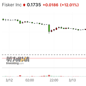 财联社3月16日讯(编辑 赵昊)周五(3月15日)美股盘前,美国电动汽车制造商菲斯克(Fisker)明显反弹,盘前一度涨超40%,但开盘后涨幅迅速缩减至12%附近,现报每股0.173美元。