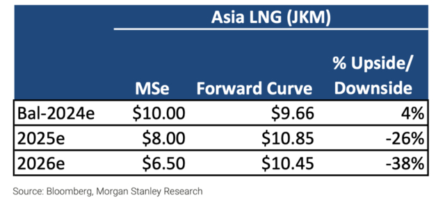 摩根大通表示,虽然LNG价格的风险回报对于2024年剩余时间看起来相当平衡,但到了2025年中期,预计产能扩张将重新锚定全球天然气市场在供应的边际成本上。预计JKM(亚洲LNG)价格到2025年为每百万英热单位(mmbtu)8.00美元,比期货价格降低26%,2026年将为6.50美元,比期货低38%。随着LNG市场转向供应过剩,欧盟天然气价格也应该下降。