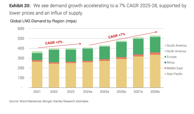 摩根大通将2025-28年的LNG进口量平均预期提高2%,主要由欧洲、东南亚、印度和中国带动。总体而言,非欧盟需求增长在2021-23年平均为3%,预计到2025-28年需求的年复合增长率(CAGR)增加到7%。