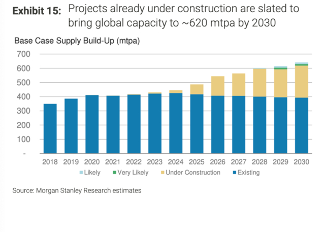 研报显示,目前已有超过每年1.5亿吨的产能正在建设中,目前全球每年约4亿吨的市场供应,到2026年总供应量预计增加到每年6.2亿吨。由于供应过剩,亚洲和欧洲LNG价格将大幅下降,带动需求增长。