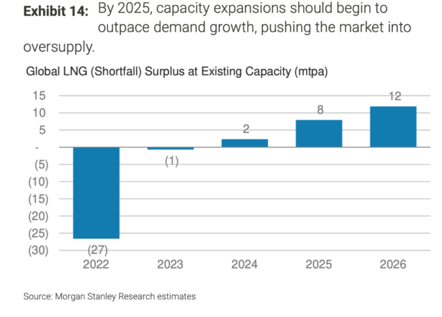 研报认为,现在又一个扩张浪潮即将来临。过去几年的高价格触发了LNG的新一轮投资周期,目前已有超过每年1.5亿吨的产能正在建设中。对于目前每年约4亿吨市场供应来说,这是显著的供应增长,到2026年总供应量预计增加到每年6.2亿吨。摩根大通预计,这些额外的供应将推动市场在未来几年重新回归平衡,并最终过剩。