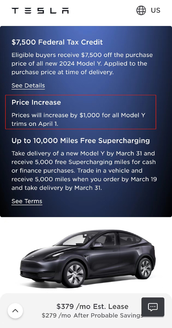 特斯拉美国:所有Model Y将在4月1日涨价1000美元 环球市场播报 2024.03.1611:07 关注 特斯拉美国官网显示,所有Model Y车型的价格将在4月1日上涨1000美元。 涨价后,Model Y售价为43990美元,长续航版售价48990美元,而高性能版售价则为52490美元。