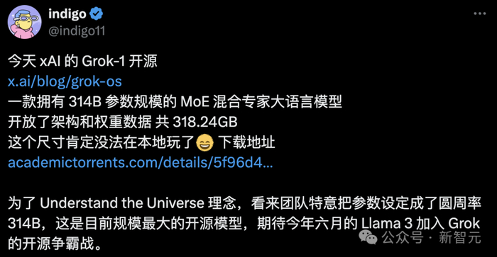 网友indigo表示,为了「理解宇宙」的理念,看来xAI团队特意把参数设定成了「圆周率 314B」,这是目前规模最大的开源模型,期待今年6月的Llama 3加入Grok的开源争霸战。