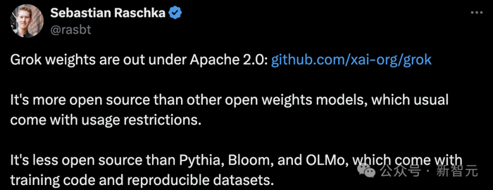 AI研究人员Sebastian Raschka表示,与其他通常有使用限制的开源模重模型相比,Grok更为开源。不过它的开源程度低于Pythia、Bloom和Olmo,后者提供了训练代码和可重现的数据集。