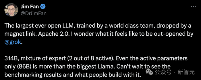英伟达高级科学家Jim Fan表示,「有史以来最大的开源大模型,由世界级团队训练,通过磁力链Apache 2.0发布。