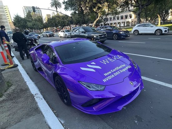 这两天,GTC大会肉眼可见地人气爆棚,圣何塞会议中心周围四处飘扬着英伟达GTC大会的道旗广告,街上到处都是佩带标志性英伟达绿badge的参会者。还有一些英伟达合作伙伴们花式助阵,比如宇树科技派出机器狗阵队,当街调戏美国本土狗;WEKA别出心裁地在附近街边停靠了几辆吸睛的紫色汽车,汽车前盖上大字写着“现已获得NVIDIA DGX SuperPOD认证”。