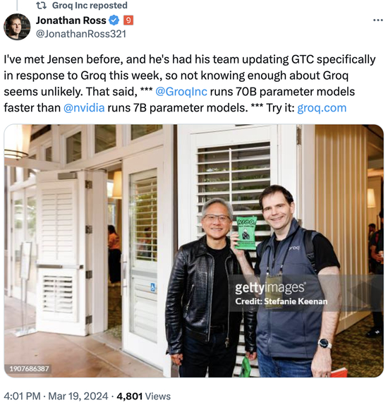 事情还没完,Groq创始人兼CEO Jonathan Ross随即在社交平台上发文并晒出跟黄仁勋的合照:“我之前见过黄仁勋,他的团队本周专门更新了GTC,以回应Groq,所以对Groq不太了解似乎不太可能。也就是说,***Groq运行700亿参数模型的速度比英伟达运行70亿参数模型的速度快。***体验一下:groq.com”