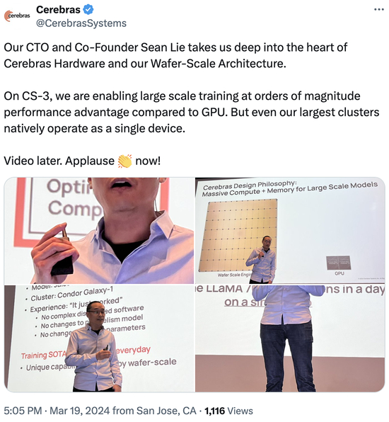 Cerebras不忘发文踩一脚GPU:“在CS-3上,与GPU相比,我们能够以数量级的性能优势进行大规模训练。但即便是我们最大的集群本身也是作为单个设备运行的……现在👏🏻鼓掌!”