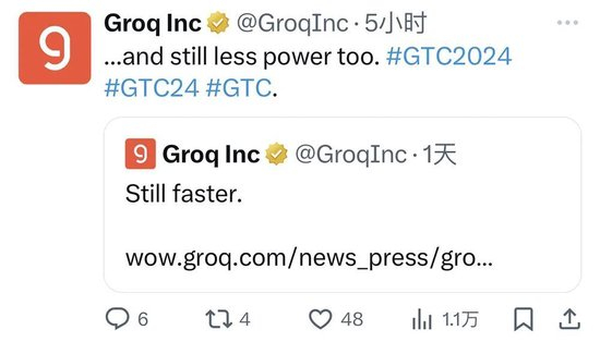 特别是与Groq的交锋,快演成反转电视剧了,昨天英伟达GTC主题演讲刚结束,以碰瓷科技大佬出圈的大模型推理芯片创企Groq就发文,指名道姓地硬刚英伟达表态:“依然更快”。今天Groq又追加一句“……而且也依然功耗更少”。