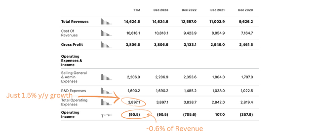 在运营方面,该公司展示了负责任地管理公司的决心。这是否是因为激进投资者的持股可以争论,但令我感到鼓舞的是,该公司在 2023 财年的收入同比增长了 16.5%,而同期的支出同比仅增长了 1.5%。与此同时,毛利率增长了 1% 至 26%,该公司在 2023 财年按营业利润计算几乎实现盈利。