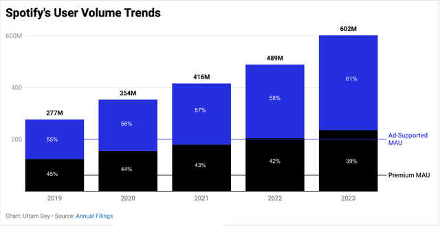 Spotify 的核心市场正在饱和,这一点可以从2023 财年第四季度收益报告中看出。根据下图,其整体月度活跃用户数 (MAU) 的增长速度快于高级订阅量的增长速度。