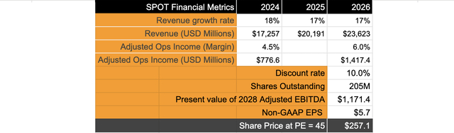 Spotify 管理层令人印象深刻地带领这艘船走向可持续增长。鉴于强劲的业绩,假设收入和非公认会计原则营业收入预测略高于共识预测的中点。根据这些假设,Spotify 的收入将以 17% 的复合增长率增长,而其调整后的营业收入的增长速度应是其收入的两倍,同期复合年增长率为 35%。