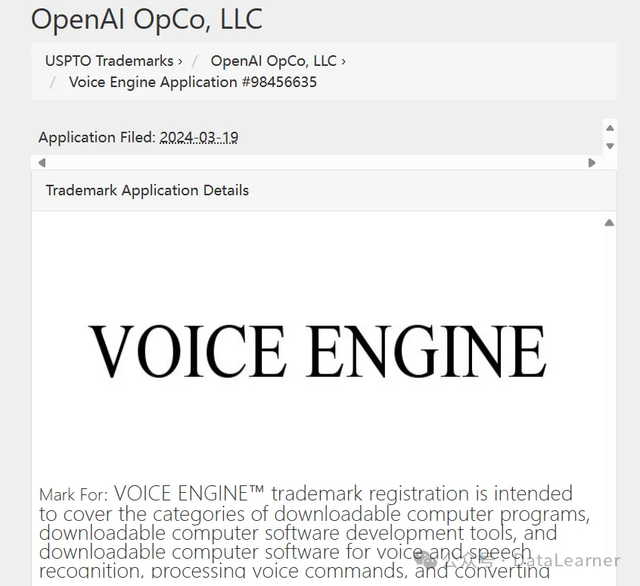 Voice Engine是OpenAI最近提交一个商标名称,其内容主要包含了语音识别和语音合成相关的内容。