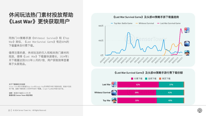 《Last War:Survival Game》通过引入街机休闲玩法,并大量投放休闲玩法素材,突破了传统SLG手游用户获取瓶颈,下载量快速增长,2024年1月达到2023年11月的7倍。同热门4X策略手游《Whiteout Survival》和《Top War》类似,《Last War:Survival Game》有近60%的下载量来自付费下载,但用户获取效率显著高于头部竞品。