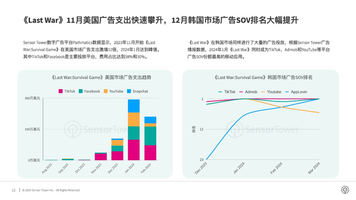 在韩国市场《Last War:Survival Game》同样进行了大量的广告投放,2023年12月开始广告SOV排名快速提升,2024年1月同时成为TikTok、Admob和YouTube等多个平台广告SOV最高的移动应用。