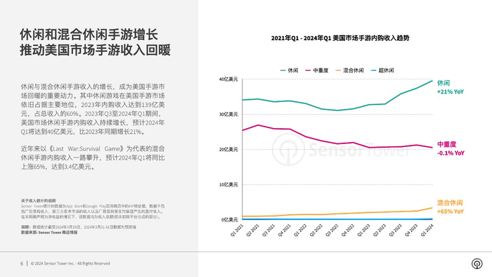 在产品模型方面,休闲游戏在美国市场依旧占据主要地位,2023年贡献了60%的手游总收入。与此同时,美国玩家在休闲手游中的支出持续上涨,2024年Q1同比增长21%至40亿美元,成为美国手游收入回升的主要推动力。