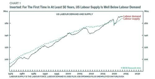 但在疫情大流行之后,长期存在的模式发生了逆转:美国劳动力供应出现了更猛烈的下坠——开始远远低于劳动力需求,随后才逐渐复苏试图赶上。这意味着,在过去几年里,推动经济周期的不是劳动力需求,而是劳动力供给。