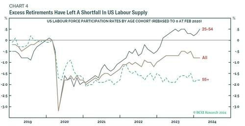 在随后几年里,大量壮年劳动力就业参与率的急剧下降已出现了明显逆转,导致劳动力供应强劲复苏。 但是,过多的退休人口其实并没有逆转,也不太可能逆转。