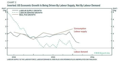 重复一遍,美国劳动力需求已经陷入衰退。但在倒挂经济中——劳动力供给是产出的制约因素,劳动力供给推动着眼下的GDP周期。
