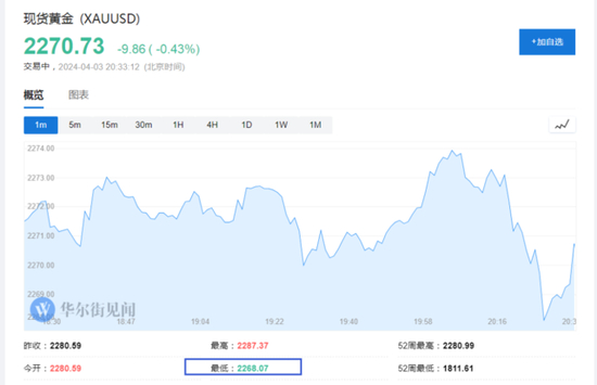 现货黄金短线跌幅扩大至5美元,暂报2268美元/盎司。