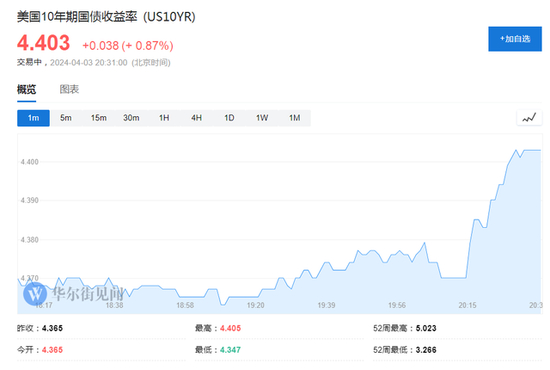 美国10年期国债收益率升幅超3bp,现报4.403%。