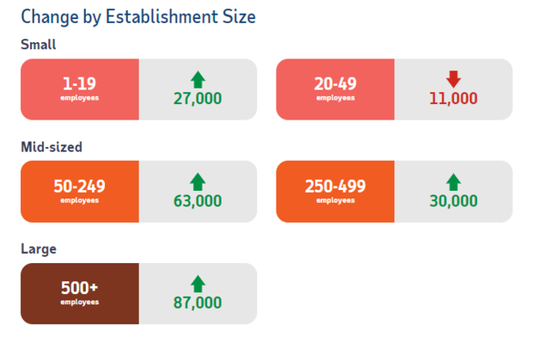 从公司规模看,人数规模在50-249人的中型企业就业人数增长最多,达到6.3万人,20-49人的小型企业就业人数减少,减少1.1万人。