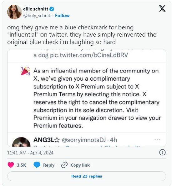 用户还分享了他们从X那里收到的关于这个新礼物的留言,其中一人强调了讽刺意味,称该平台正在向有影响力的人赠送“蓝V”,“他们只是重新发明了(推特)原来的蓝色认证标记。”