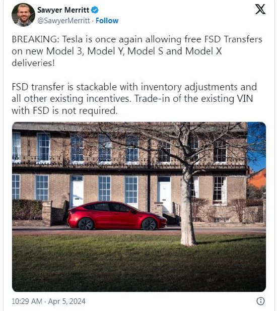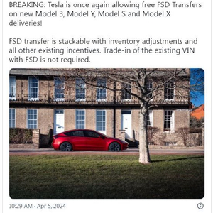 他在X上的一条帖子中写道:“特斯拉再次允许新款Model 3、Model Y、Model S和Model X的免费FSD转移!FSD转移可与库存调整和所有其他现有奖励措施叠加。”