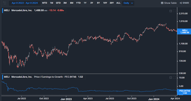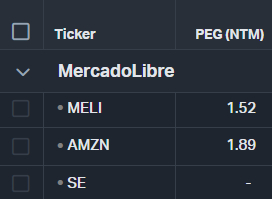 我们的能见度很低,我们可以得出的结论是,亚马逊对MercadoLibre有溢价,但Sea仍然没有为我们使用PEG带来永久利润。因此,我们将使用MercadoLibre的PEG历史记录:
