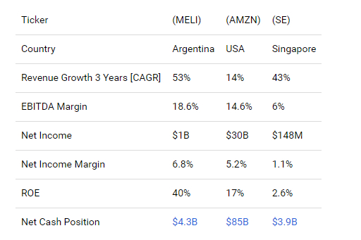 接下来,分析师将MercadoLibre与亚马逊和Sea等全球同行进行比较: