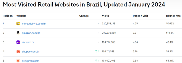 MercadoLibre自称是拉丁美洲最大的电子商务公司,数据证明了这一点。根据SemRush网站的数据,2024年1月,MercadoLibre巴西网站的月访问量为3.2亿次,其次是亚马逊(AMZN),访问量为2.89亿次,第三名是巴西玩家,访问量为1.54亿次,第四和第五名巨头Shopee和AliExpress的访问量分别为1.06亿和1.04亿。