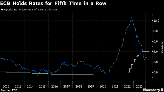 欧洲央行连续第五次会议维持利率不变,同时发出央行迄今最明确的信号,即通胀降温将很快使其可以开始降息。