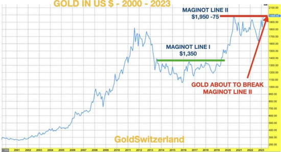 Greyerz指出,在2002年从每盎司300美元涨至2011年的1920美元后,黄金在2013年至2016年间再次经历了一次长期回调。Greyerz在2019年2月的文章中预测了第一道“马奇诺防线”的突破,而在2023年3月,第二道“马奇诺防线”的突破变得显而易见。Greyerz表示,这预示着金融系统的衰落已经开始,短短几天内就有四家美国银行和瑞士信贷崩溃。