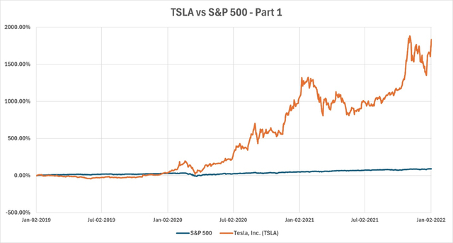 特斯拉股价的飙升让标普500指数的涨幅看起来微不足道,实际上从2019年初到2021年底的三年时间里几乎翻了一番。