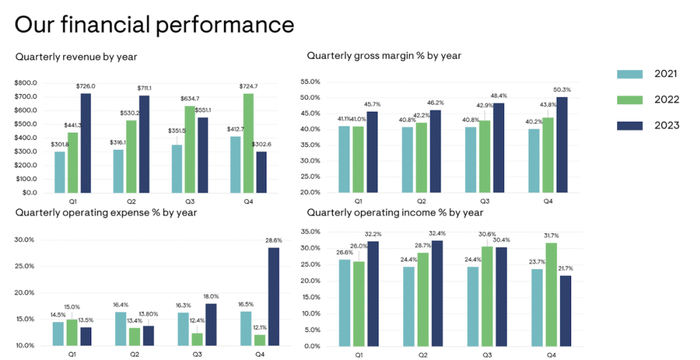 展望未来,管理层预计第一季度收入将在 2.6 亿美元至 3 亿美元之间(这意味着中点同比下降 61%)——普遍预测为 2.79 亿美元。投资者可以期待今年第三季度,届时近期严峻的财务业绩将开始允许更容易进行比较。管理层预计非 GAAP 运营利润率将达到 15.7% 左右,这反映出利润率连续一个季度大幅压缩。但我强调,考虑到周期性衰退的程度,这些利润率可以说是非常高的。