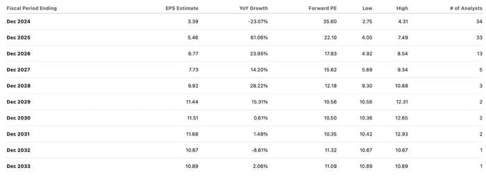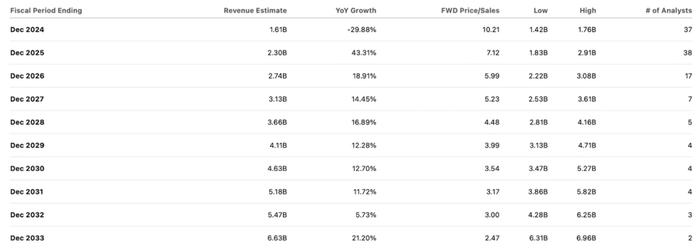 该股的交易价格是今年销售额的 10 倍,普遍预计明年将开始强劲复苏。市场普遍预计 2025 年收入为 23 亿美元,但仍低于 2022 年的数字。