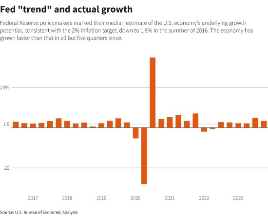 美国国会预算办公室最近提高了对美国潜在经济增长的预期,理由是移民增加和劳动生产率提高,这些因素将在不产生通胀的情况下实现经济扩张。尽管美联储官员承认,这两种力量都以惊人的速度帮助降低了去年的通胀——为一些人所称的“完美的反通胀”铺平了道路,但目前尚不清楚这一效果会有多深。