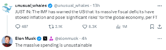 一位X用户发帖称:“IMF警告美国,其巨额财政赤字已引发通胀,并对全球经济构成重大风险。”
