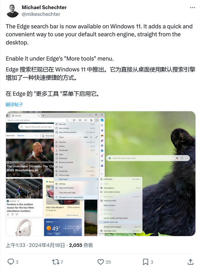 IT之家 4 月 19 日消息,微软近日发布 Windows 11、Windows 10 系统更新,在桌面整合了 Edge 搜索栏。微软官方表示引入该功能,其目的是简化用户的搜索体验,不需要打开浏览器窗口就能搜索相关内容,提高工作效率和便利性。