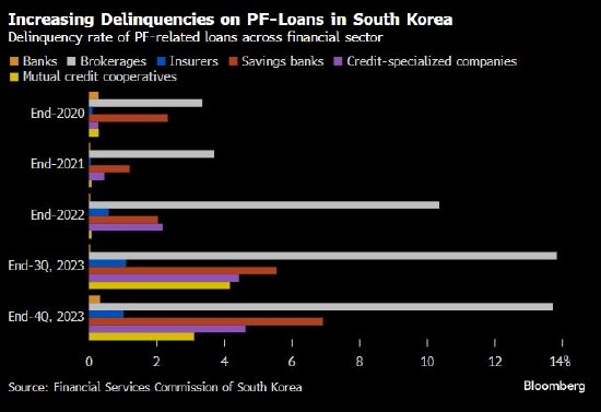 韩国信贷市场出现问题的第一个迹象出现在大约19个月前,当时位于首尔东北部的乐高乐园(Legoland)的开发商未能偿还项目融资贷款,导致韩国短期债务收益率出现全球金融危机以来的最大涨幅。然后,在去年7月,由于担心房地产押注时机不合时宜,一家非银行贷款机构、韩国最大的信用合作社之一的一家分行被迫关闭。