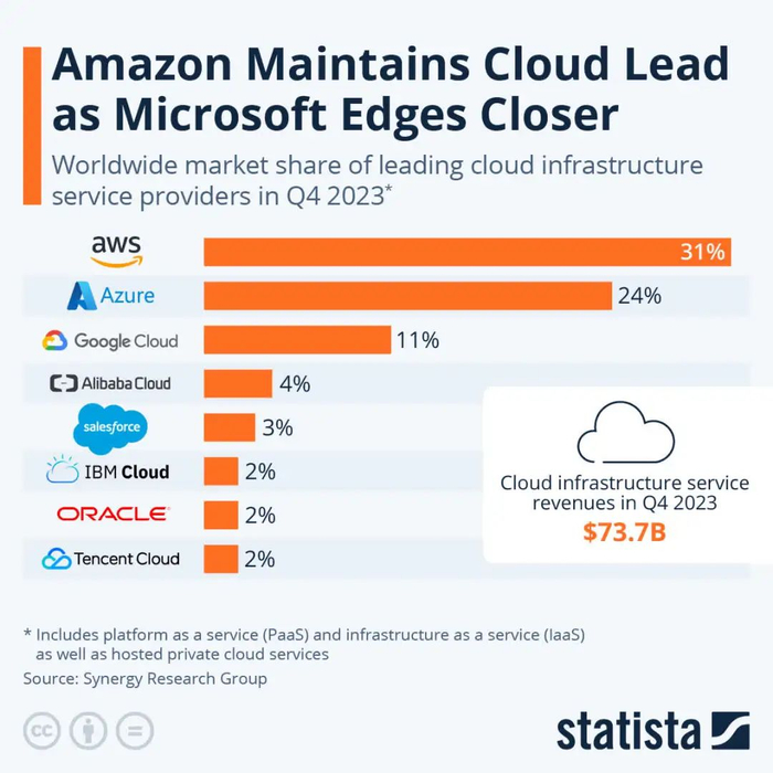最后,在最近的财报电话会议上,CFO Amy Hood重申,Azure和云服务部门6%的收入增长来自AI。这意味着Azure的收入在本季度增长了30%,而AWS的收入增长了13%。微软仍然是数十亿云计算市场的第二大参与者,占据24%的市场份额,仅次于AWS的31%市场份额。