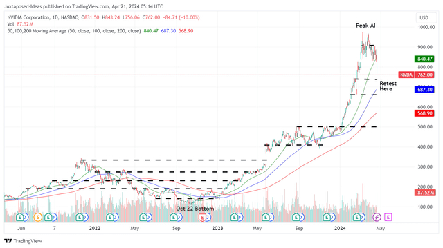 英伟达自近期峰值以来已经回调了-19.7%,该公司将于2024年5月22日之前报告下一次财报。