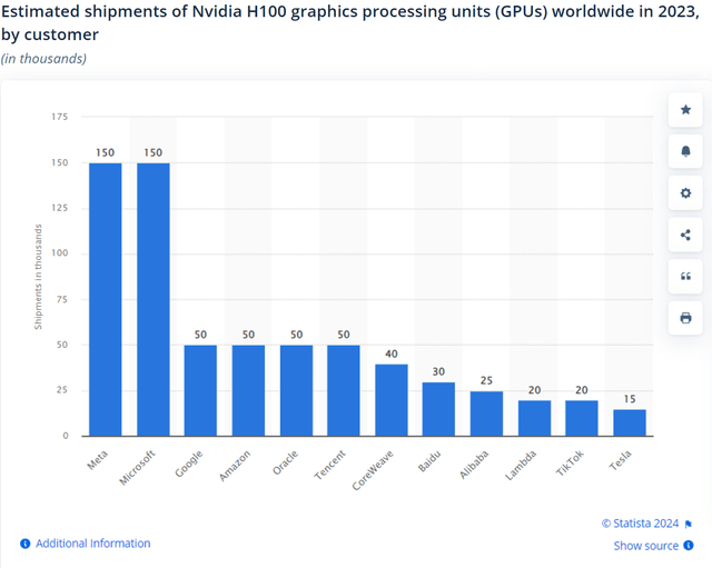 2023年,Meta和微软也出现了同样强劲的需求,这两家公司占据了英伟达H100订单的大部分,基于15万个出货量和35,000美元的出货量,预计每笔金额高达$52.5亿。