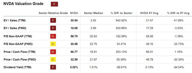尤其是,与直接同行相比,英伟达本质上更便宜,例如AMD的40.78倍和英特尔的25.26倍。这是由于前者预计2023财年至2027财年的复合年增长率为+81.2%,而同期AMD为+20%,英特尔为+12.5%。
